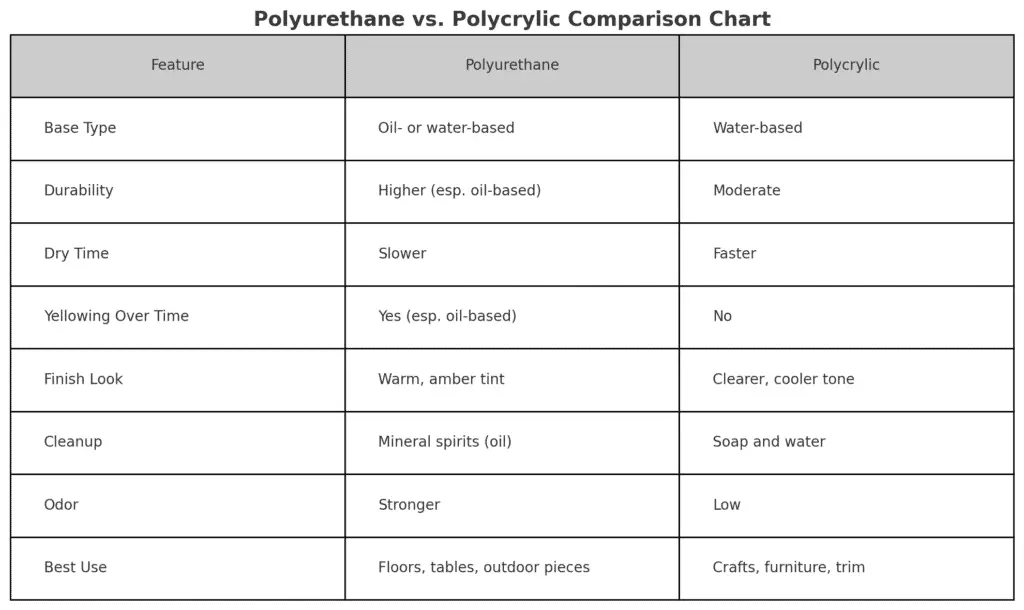 Understanding the differences between polyurethane and polycrylic helps you choose the right finish based on your project’s durability needs, environment, and aesthetic goals.